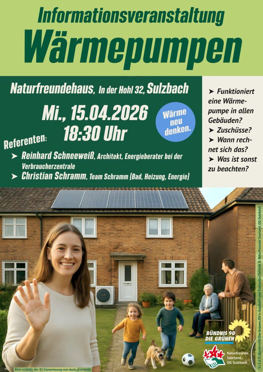 Die Ortsverbände Sulzbach und Dudweiler von Bündnis 90/Die Grünen sowie die Naturfreunde Ortsgruppe Sulzbach laden am Mittwoch, 15. April 2026, um 18:30 Uhr herzlich ein zu einer umfassenden Informationsveranstaltung rund um das Thema Wärmepumpen.